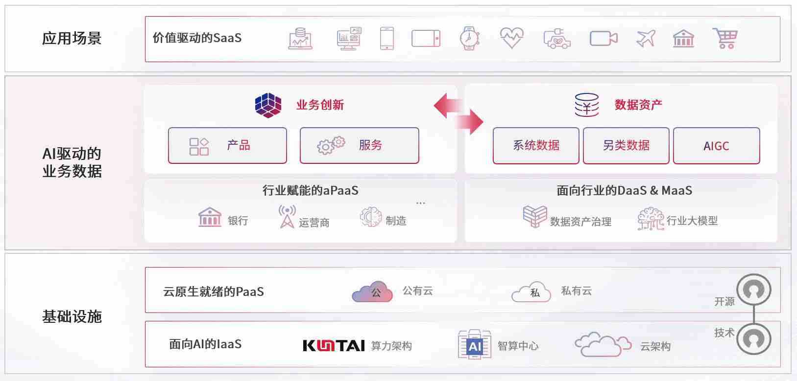 数字时代,,,,围绕企业数字化转型的关键要素,,,,尊龙z6数码开创性的提出数云融合战略和技术体系框架,,,着力在云原生、、数字原生、、、AI原生和信创产业上架构产品和服务能力,,,为处在不同数字化转型阶段的快消零售、、、、汽车、、金融、、、、医疗、、、政企、、、教育、、运营商等行业客户提供泛在的敏捷IT能力和融合的数据驱动能力,,,,构建跨界融合创新的数字业务场景和新业务模式,,,助力企业级客户建立面向未来的核心能力和竞争优势,,,,全面推动社会的数字化、、、智能化转型升级。。。