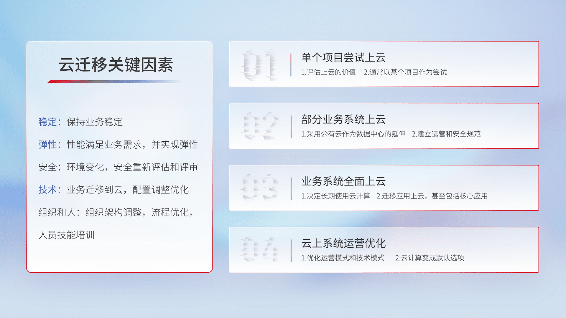 结合实际业务,,,从规划设计、、云平台选型、、云原生改造、、数据迁移、、、、集成交付,,,,迁移全过程为客户识别最佳上云路径,,,做好风险识别管理,,,设计网络架构、、、、身份权限、、、、安全审计合规、、操作审计、、、、日志审计、、监控告警策略、、多站点容灾设计等,,,,对云上基础设施进行整体规划,,,,提升IT治理水平,,,,以满足弹性、、高可用、、、高性能的需求。。。。